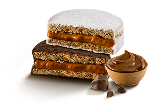 Ingredientes:azúcar, leche, harina de trigo, pasta de cacao, margarina, glucosa, manteca de cacao, huevo en polvo, almidón de maíz, miel, cacao en polvo, sorbitol E420ii, bicarbonato de sodio E500ii, lecitina de soja E322, sal, bicarbonato de amonio E503ii, vainillina, limón natural aroma, sabor almendra. Alérgenos:leche, huevo, nueces, almendras Almacenamiento:Conservar en un lugar fresco y seco.